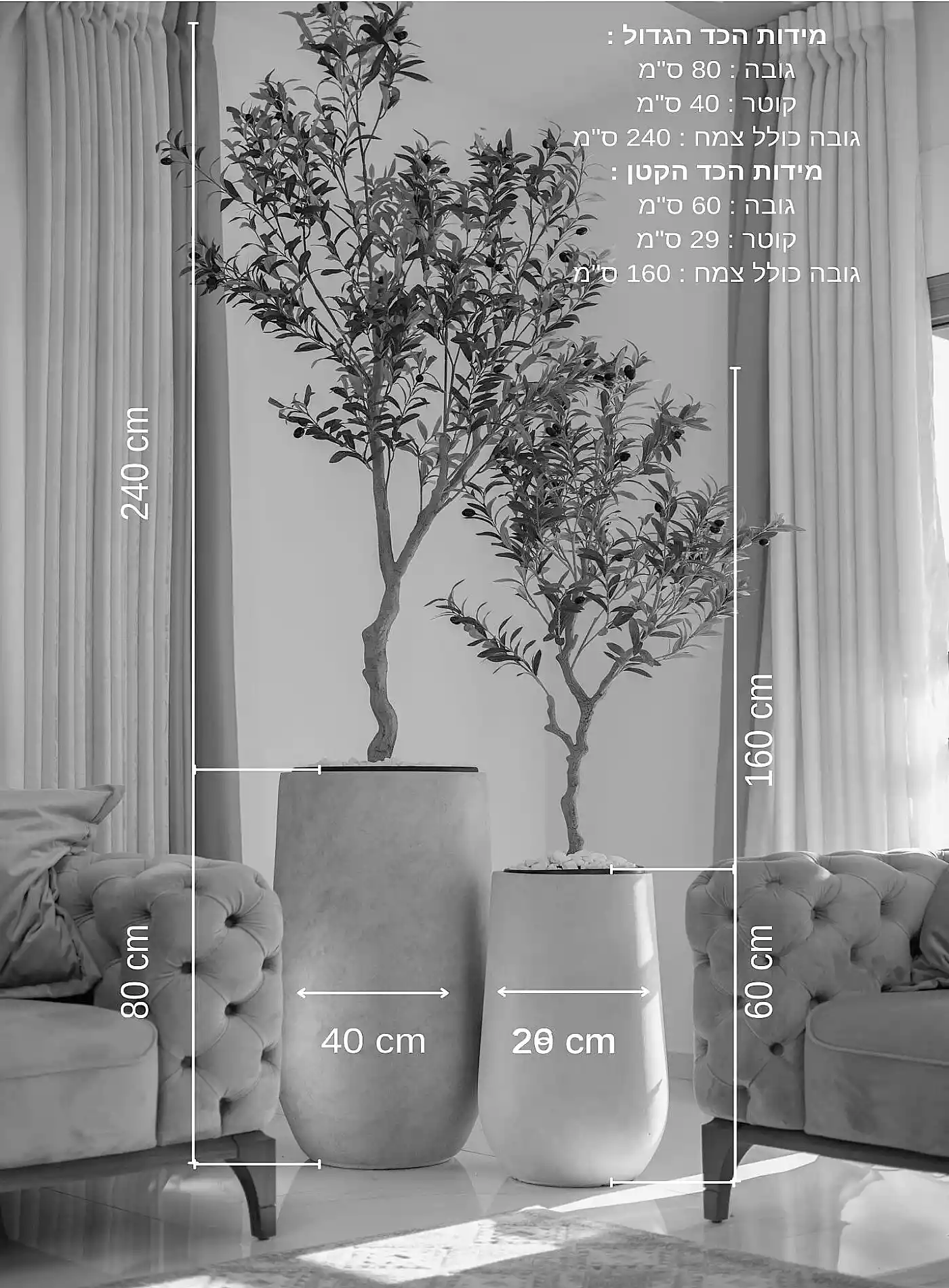 סט זוגי בעיצוב אליפטי נקי ויוקרתי – עצי זית מלאכותיים בתוך כדים עשויים פיברגלס קל ועמיד.