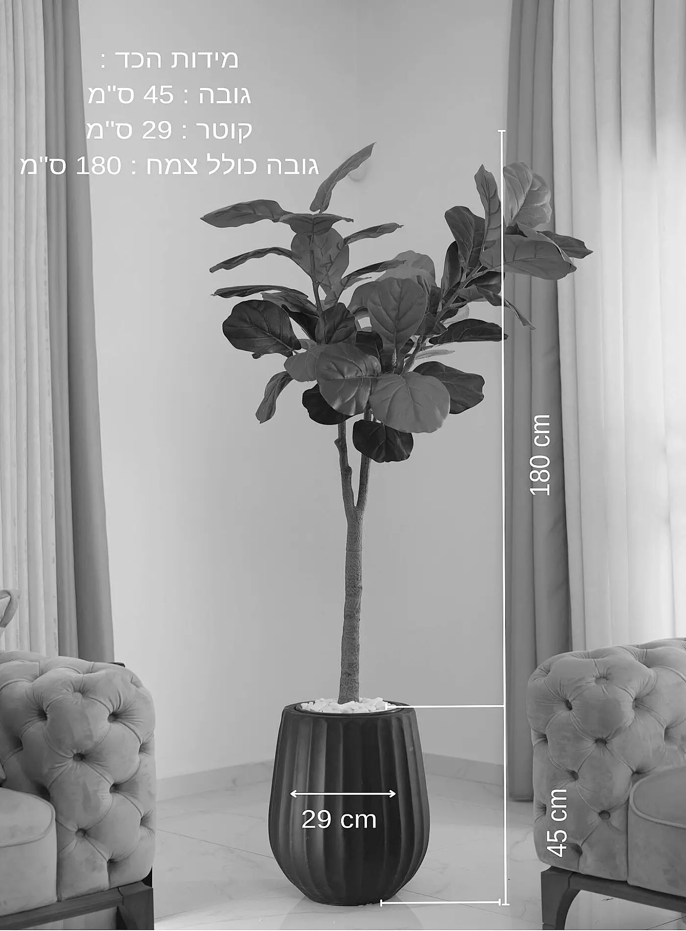 כד מדגם ELEGANCE מעוצב עם פסים עדינים, שמוסיפים מגע של אלגנטיות לכל חלל. הדגם מגיע בשלושה צבעים אלגנטיים: לבן, שחור ואפור, שמתאימים לכל עיצוב פנים. הפסים הדקים נותנים לכדים מראה מודרני ומרשים, בעוד שהגימור האיכותי מבטיח תחושת יוקרה וסטייל. הכד כולל צמח פיקוס כינורי מלאכותי, שמוסיף טבע ורעננות, ומביא את העיצוב לרמה גבוהה. כדים אלו הם הבחירה המושלמת לשדרוג הבית או המשרד, ומציעים מראה יוקרתי ותחזוקה קלה.