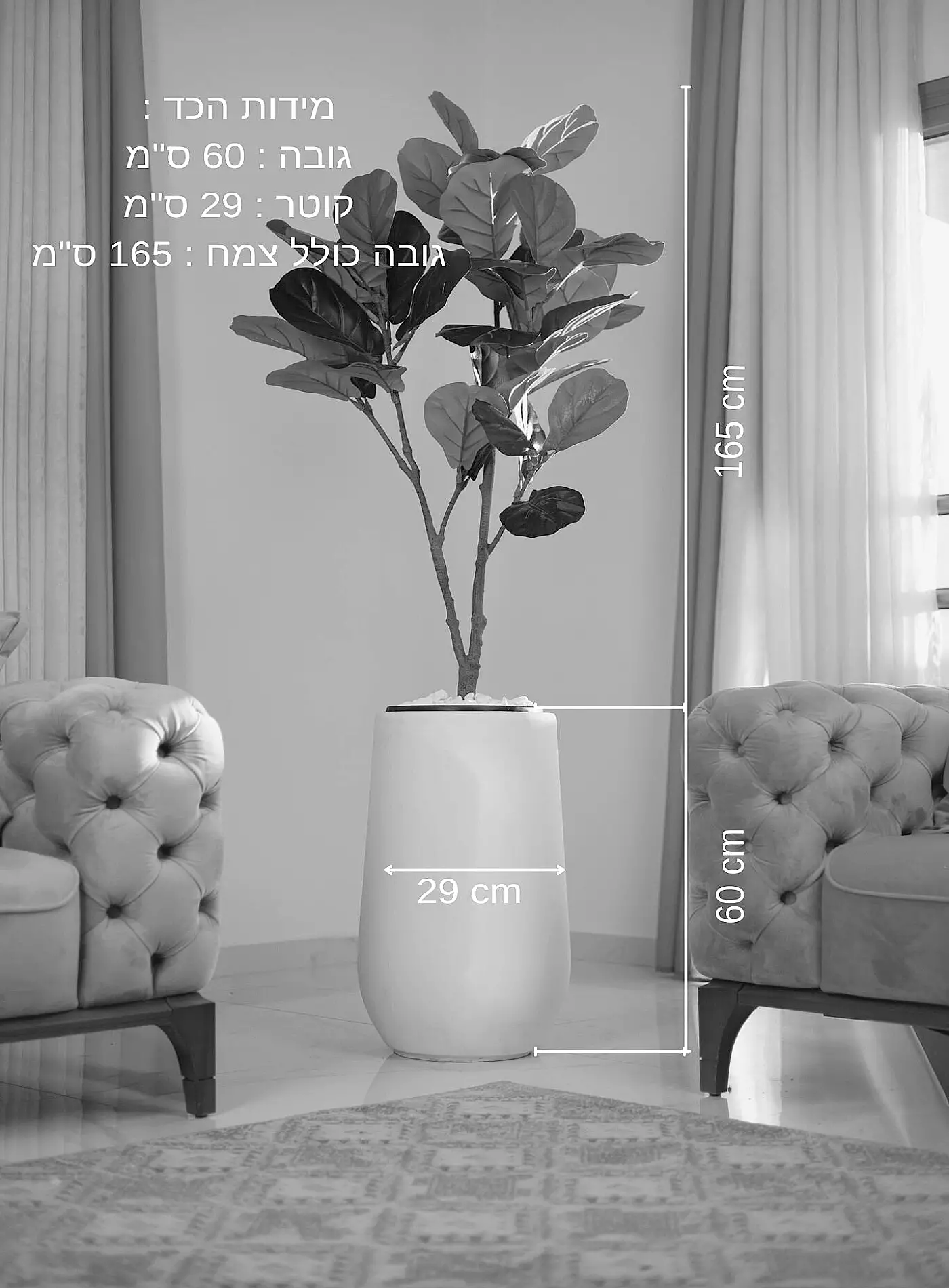 כד SERENITY בעיצוב מודרני ואלגנטי, עשוי פיברגלס (בטון קל) לעמידות מירבית. זמין בצבעים לבן, שחור אפור וסהרה , ומשתלב מושלם עם פיקוס כינורי מלאכותי שמוסיף יוקרה ורעננות ללא תחזוקה.