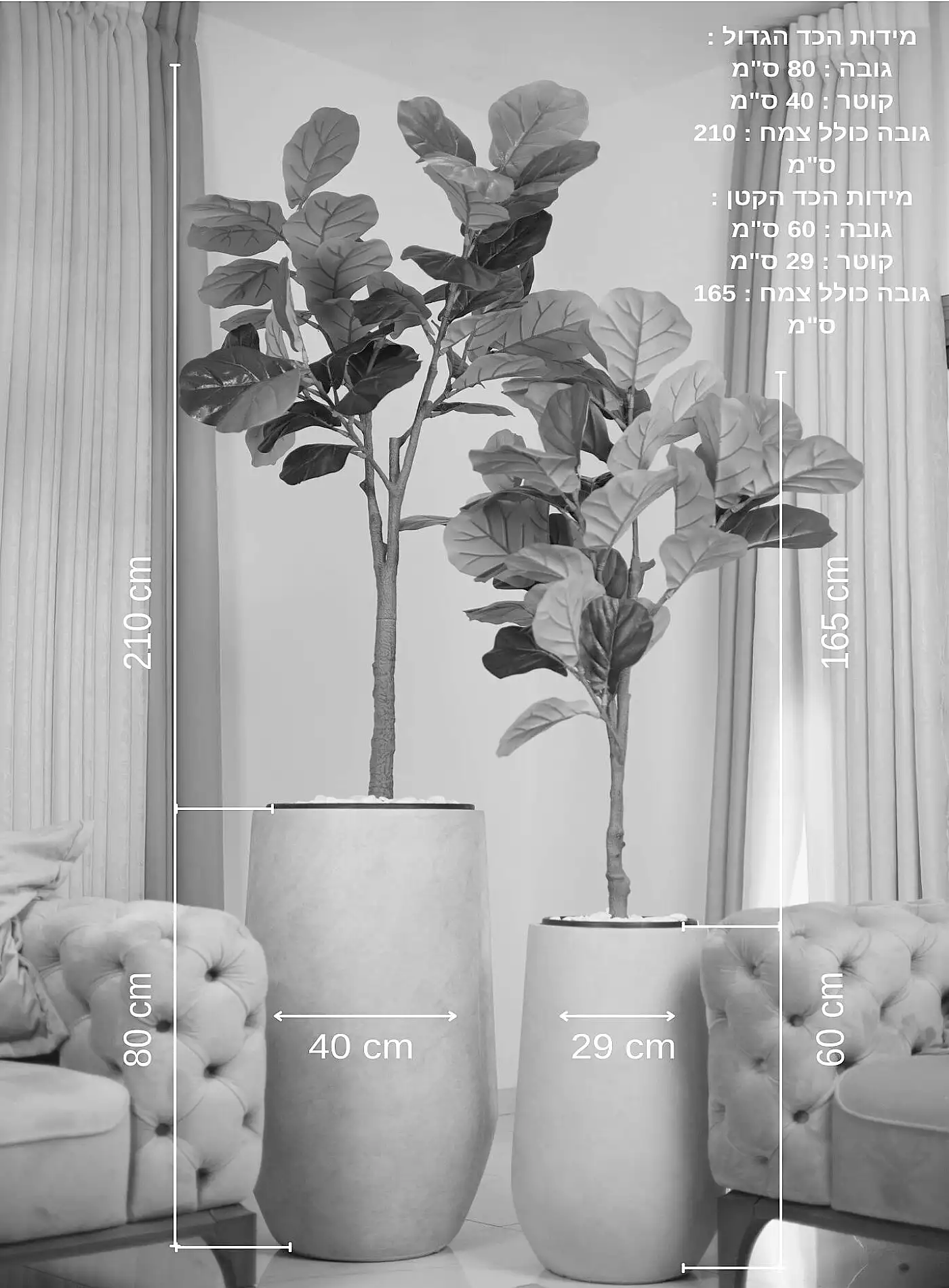 סט זוגי בעיצוב אליפטי נקי ויוקרתי – פיקוס כינורי מלאכותי בתוך כדים עשויים פיברגלס קל ועמיד.
